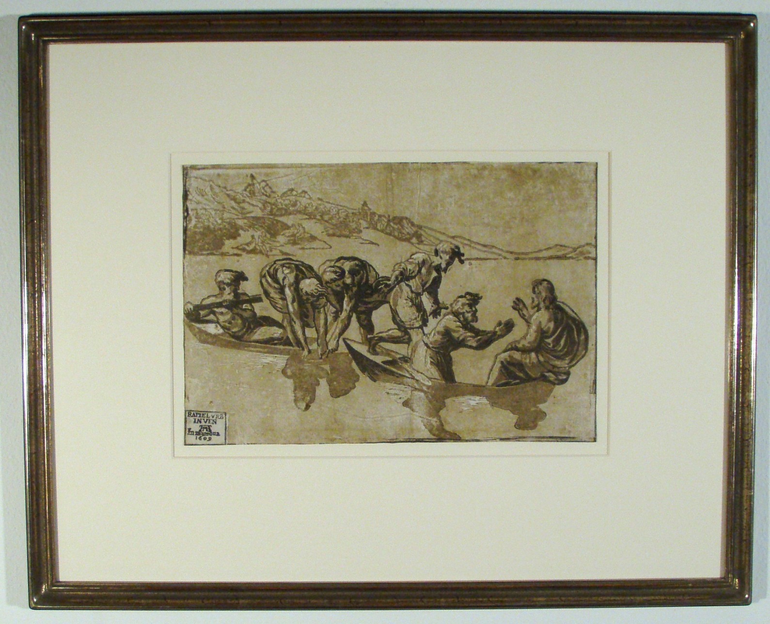Gezeichnet und geschnitten nach einem Motiv von Raphael. Das Blatt wurde ursprünglich dem Spätwerk Ugo da Carpis zugeschrieben, wird aber neuerdings der von Andrea Andreani aufgekauften bolognesischen Werkstatthinterlassenschaft zugerechnet, in der sich viele Holzstöcke Vicentinos befanden. Bei dem vorliegenden Blatt handelt es sich um einen Druck Andreanis aus dem Jahr 1609 mit dem von ihm hinzugefügten Monogramm. Es zeigt den gleichen Zustand, wie das Blatt aus den Weimarer Kunstsammlungen (dort Ugo da Carpi zugeschrieben), wobei im Weimarer Blatt allerdings das Monogramm fehlt. Das Blatt aus der Graphischen Sammlung der ETH Zürich demonstriert, daß Andreani die Platten für den finalen Zustand überarbeitet hatte, wobei vor allem die Himmelpartie Lichter erhielt. Bei dem vorliegenden Blatt könnte es sich also um einen unikaten Zwischenzustand handeln, etwa um einen Probedruck. Die Quetschfalten in der Mitte des Blattes deuten darauf hin, daß man beim Drucken keine große Sorgfalt walten ließ und das Papier vor dem Druck zu stark angefeuchtet wurde. Der Farbauftrag ist allerdings sehr satt und das Druckprofil tief.