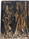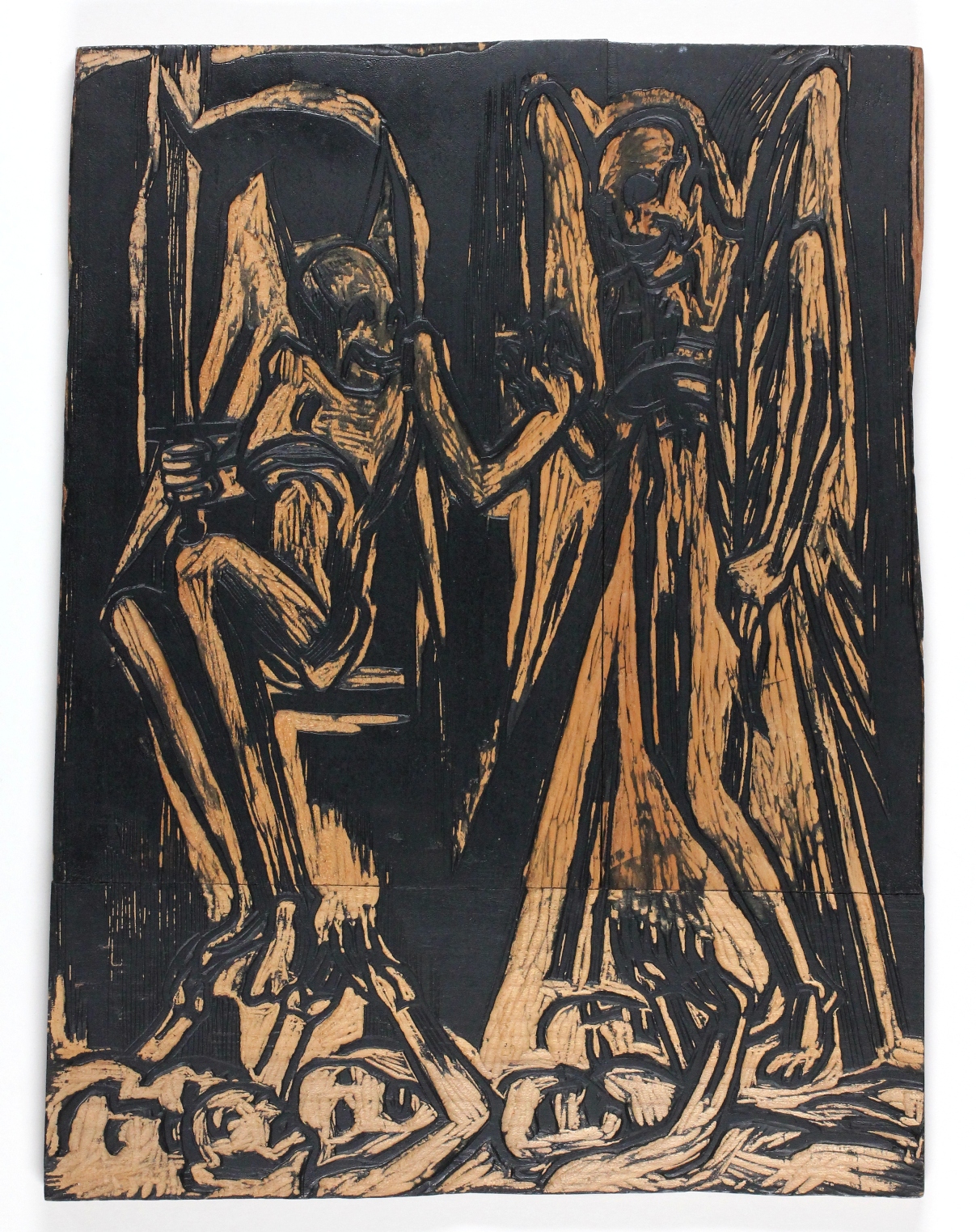 Dieser Druckstock des Expressionisten F. M. Jansen zeigt in schöner Weise die Spontaneität der Arbeitsweise im weichen Langholz. Zusätzlich wurde bei diesem Stock die untere Partie der Zermalmten neu angesetzt oder ergänzt. Ergänzungen, Umarbeitungen und Einsetzungen bei Holzstöcken finden sich schon in der Renaissance, so zum Beispiel im Blatt von Niccolò Boldrini "Sechs Heilige", wo der Kopf des Sebastian ausgetauscht wurde, oder bei dem Dürer zugeschriebenen Andachtsblatt "Christus am Kreuz mit drei Engeln", bei dem ebenfalls die untere Partie ergänzt wurde. Weitere Beispiele in neuerer Zeit finden sich bei Käthe Kollwitz, die nicht müde wurde, ihre Platten und Stöcke weiterzubearbeiten, was uns unzählige spannende Zustandsdrucke bescherte. |