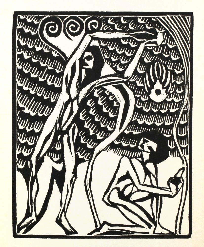 Drama von Arnošt Dvořák. Einbandgestaltung und 3 Weißlinien-Holzschnitte von Jiří Kroha. Čin , Prag 1923. |