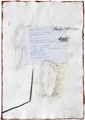 Die von Schutting für dieses Projekt zur Verfügung gestellten Gedichtskizzen waren flüchtig auf verschiedene Papiersorten wie Briefumschläge oder Kartons notiert und luden so sowohl optisch als auch inhaltlich zum bildnerischen Dialog ein. Dabei hatte alles Bedeutung: die Farbe und Form des Papiers (zum Teil war es gerissen oder beschnitten), Adressaufschriften und Poststempel, die Handschrift (mit blauer Tinte), und nicht zuletzt der berührende Inhalt der Texte.