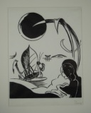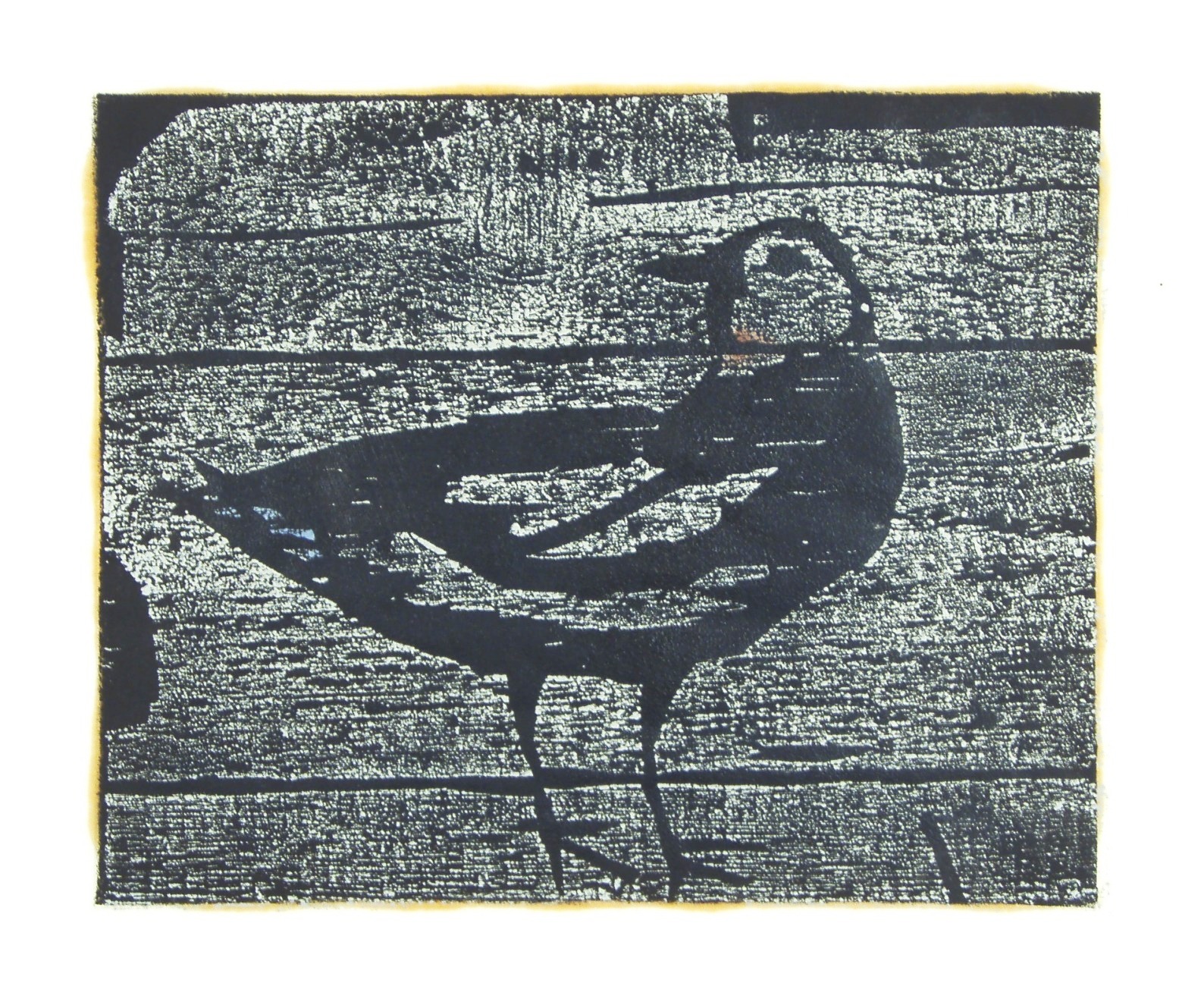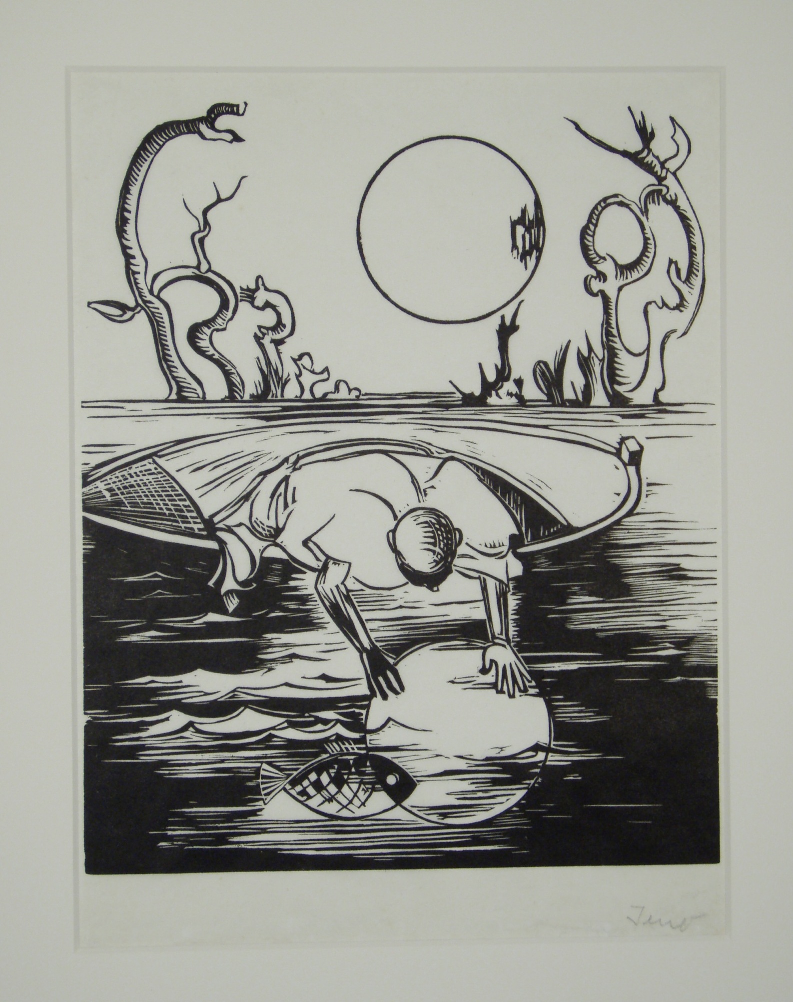 Phantasiefigur und zwei Vögel Farbholzschnitt color woodcutsold |