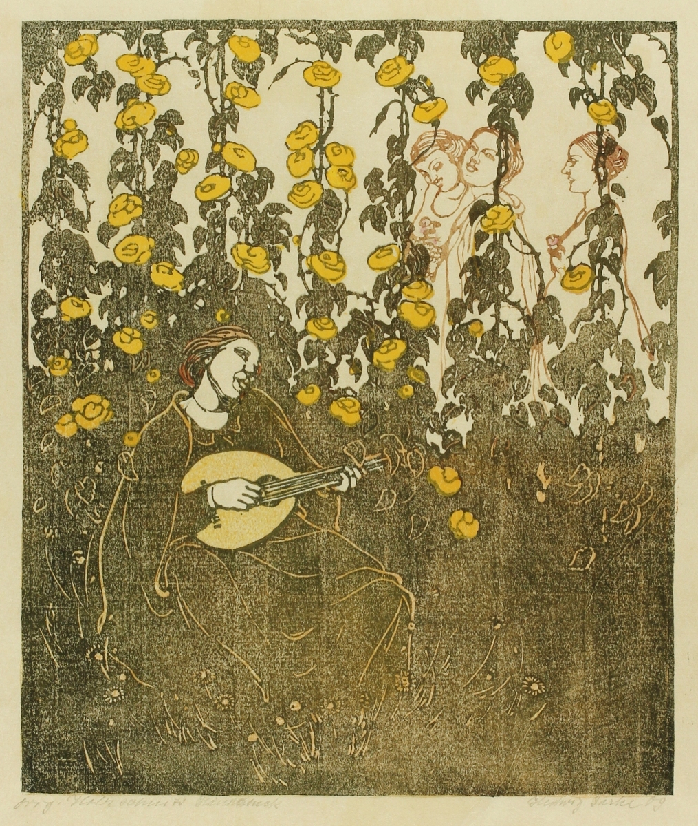 Lautenspielerin in einer Laube Farbholzschnitt color woodcutsold |